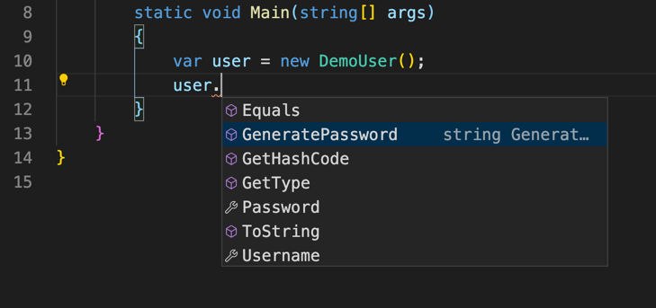 Let’s put it together. Create a DemoUser class with the New C# Class shortcut, then add properties using the prop snippet: