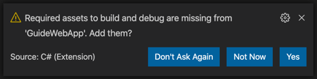 When VS Code detects a C# project, it prompts you to add build and debug assets: